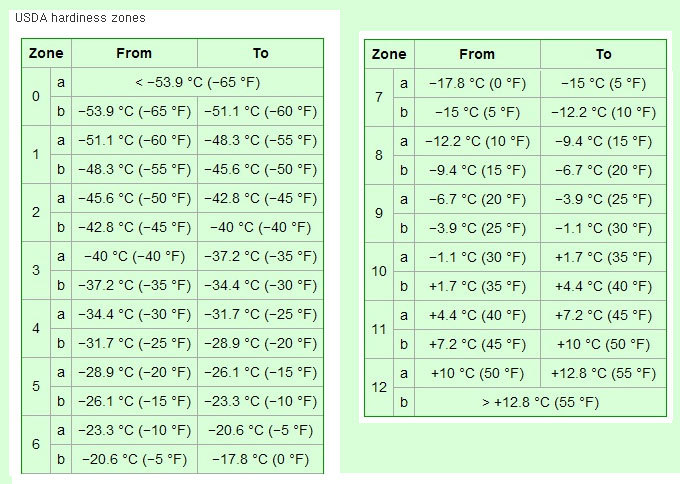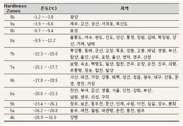 Plant Hardiness Zone이란 미국 농무부(USDA)에서 만든 식물의 내한성 강도를 나타내는 지표로 색상을 통해서 강도를 표기하고 있으며 그지역의 평균 최저기온이 (- °c)얼마까지 떨어지는지 쉽게 설명해 놓은 자료입니다. 내한성 강도를 zone1~13으로 나누었고 각 존마다 a와 b로 구분하였습니다.