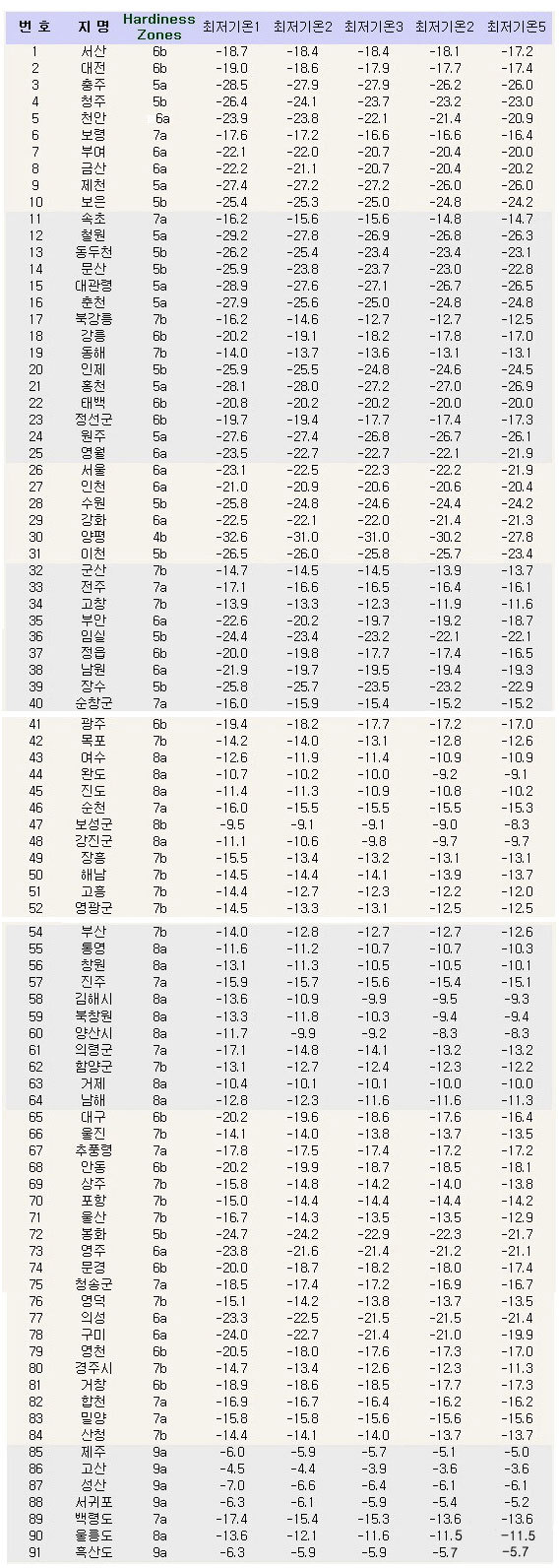 아래의 그림들은 1904년부터 2010까지의 기상자료를 취합하여 만들어 놓은 자료들입니다. 다만 각 지역의 기상관측소 설립연도가 다르고 지역마다도 관측소와 가깝거나 먼곳에 위치한 지역이 있어 같은 지역이라도 차이는 있을 수 있습니다. 존(Zone)의 구별은 USDA의 구별법을 사용했고 우리나라 온도를 조사후 존 표기를 병행한 자료입니다.