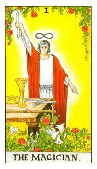 마법사는 비전과 포커스를 갖는다. 그는 창조력을 방출한다. 그의 지팡이는 하늘을 향해 높이 치켜들었다. 신성한 계시와 자신을 연결하고 있다. 그의 다른 손은 땅을 가리키고 있고 창조 에너지의 도관으로서 그의 역할을 상징화한다. 비전들을 실재로 현현한다. 그는 생명의 여행의 일부인 자각의 커리큘럼을 착수한다. 그는 에고를 초월하는 힘을 증명해 보인다. 그리고 그가 그의 테이블에 놓여있는 모든 네 가지 타로 슈트들의 상징에 의해 표상된 모든 우리의 에너지를 통합한 결과로서 느끼는 힘을 증명해 보인다. 바보가 꿈꾸는 곳과 그것을 추구하는 새로운 지평선을 찾아 설정한 곳에서 마법사는 시각화하고 시현한다.