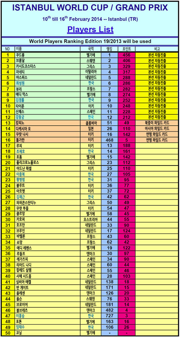 한국에서는 최성원(6위), 김경률(9위), 강동궁(12위) 선수가 UMB 세계 랭킹에 의한 본선 32강 시드를 받았으며, 조재호, 허정한, 이충복 선수 등 국내 탑 랭커들이 모두 출전하며, 역대 최다인 총 19명의 한국 선수들이 출전하여 그 어느때보다도 기대감이 높다. 특히나 터키 월드컵은 한국 선수들과의 좋은 인연이 많은데, 김경률 선수가 2010년에 국내 선수로서는 최초로 안탈리아 월드컵에서 우승을 차지했고, 2012년에는 최성원 선수가 홈팀 터키의 타이푼 타스데미르 선수를 누르고 역시나 우승을 한 바 있다.