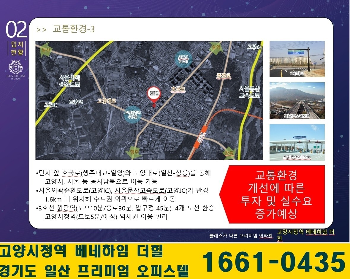 - 서울~문산고속도로(고양JC) 개통 예정으로 1.6km 내 위치해 수도권 외곽으로 빠르게 이동