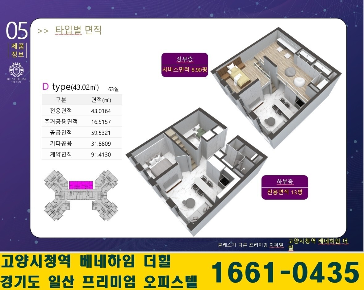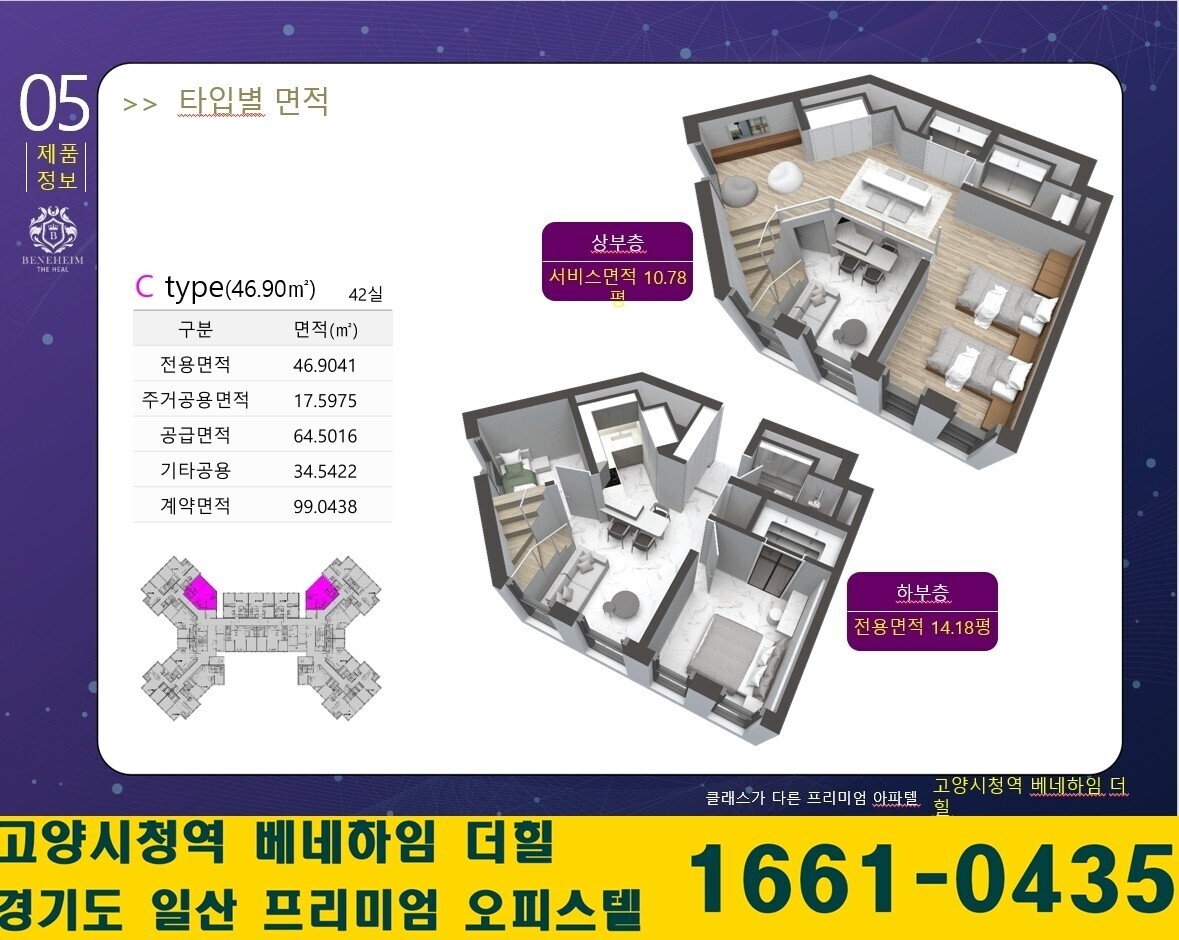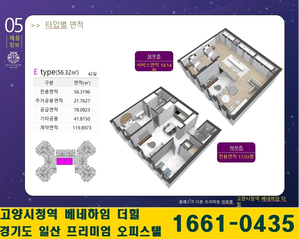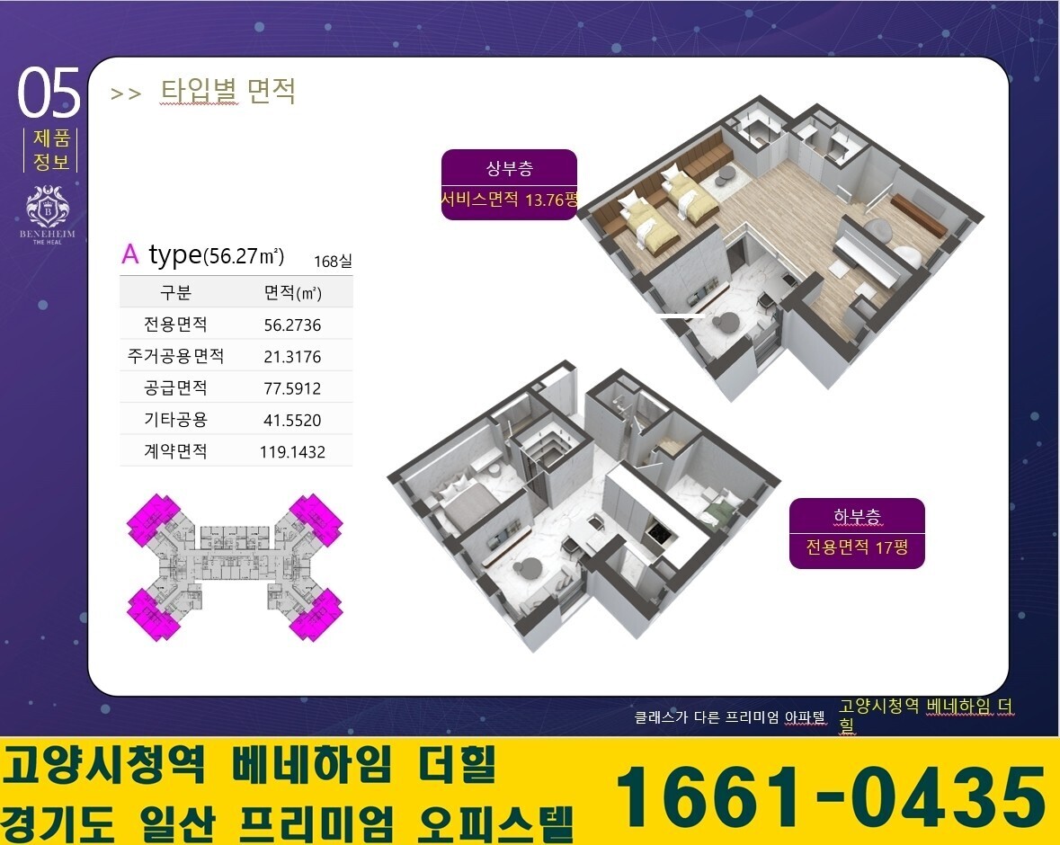 - 전용17평 기준 31평의 실사용면적을 제공하는 거주형 와이드복층형 아파텔