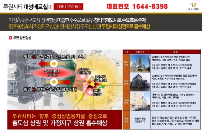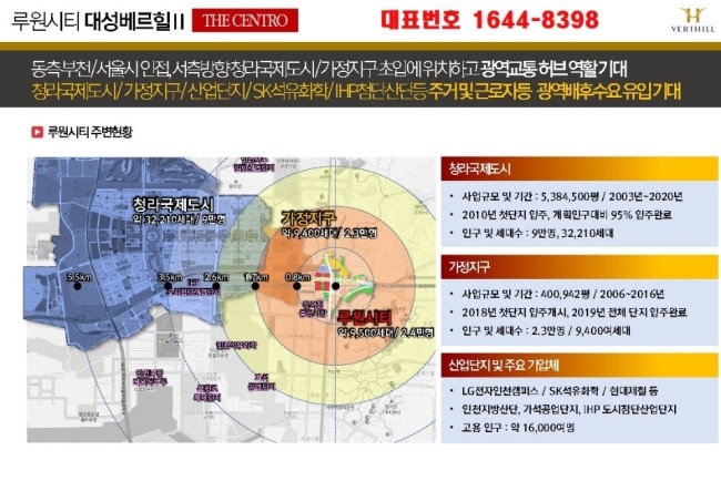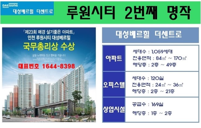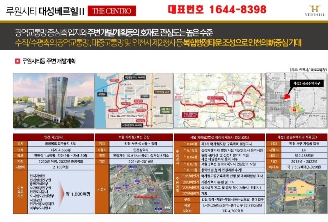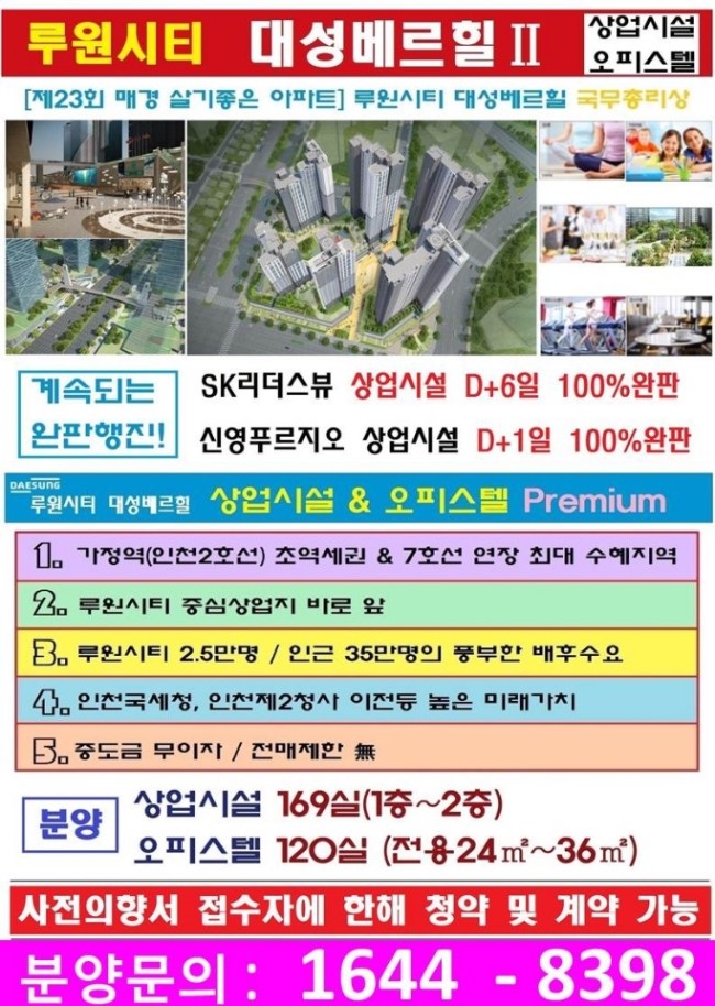 >> 제23 매경 살기좋은 아파트 국무총리상 수상한 루원 1차에 이은 대성 베르힐의 또 하나의 주거명작 인천 루원시티 대성 베르힐 2차 분양 (총 1,179세대, 최중심가 4거리 코너위치, 49층 랜드마크) 인천시청 제2청사 예정, 국세청(예정) 특급호재에 인천2호선 가정역과 7호선 루원시티역의 더블역세권에 BRT까지 있는 한 번에 완판예상되는 최고의 프리미엄 현장!! 인천 가정동 주상복합4블록 일원에 들어서는 이 단지는 아파트, 오피스텔, 상업시설로 구성된 49층 규모 초고층 복합단지. 명품커뮤니티, 혁신평면, 첨단시스템 최신설계의 아파트와 업무, 쇼핑, 문화단지 안에서 누릴 수 있는 원스탑 라이프의 오피스텔, 초역세권 입지에 도로교통망도 잘 구축돼 있어 탄탄한 배후수요를 갖춘 상가는 외부로부터의 풍부한 인구유입 효과까지 누릴 수 있어 안정적인 수익창출 예상. 2027년 서울 지하철 7호선 루원시티역(가칭)이 들어설 예정으로 향후 더블역세권 프리미엄이 기대 전망, 두 정거장 거리에 위치한 석남역에 서울 지하철 7호선(2020년 예정)이 개통을 앞두고 있어 강남 접근성또한 우수히며, 청라∼가정∼가양까지 운행하는 BRT(간선급행버스)도 있어 대중교통과 도로망도 편리합니다. 단지 옆 서인천 나들목 IC, 제2외곽순환도로 남청라 IC, 인천 국제공항 고속도로 등을 이용해 경인고속도로는 지하화가 2025년 완공예정이라 영종도와 이어지는 제3연륙교(예정)와 연결시 여의도에서 인천공항까지 40분이면 이동 가능, 수도권제2순환고속도로(인천∼김포) 등도 근거리 입니다. 가현초·중, 신현북초, 신현중·여중·고 등 여러 학교가 위치해 있고, 단지 도보 5분 거리 내 봉수초등학교가 위치해 '안심 도보통학'이 가능하다는 점에서 학부모들이 선호하며, 향후 루원시티 내 역과 초등학교, 블록 내부 동선을 잇는 보행데크(예정)가 마련돼 어린 아이들의 안전 통학 여건이 더욱 개선될 전망. 단지 맞은편에 루원시티 중심상업지구(예정)가 있고, 가정지구에 있는 각종 생활편의 시설도 손쉽게 이용. 청라국제도시 내 롯데마트, 홈플러스(청라점) 가까움. 문화공원과 가정공원, 천마산, 축곶산, 승학산 등산로 등 풍부한 녹지가 조성. 친자연적인 환경 속에서 취미 및 여가생활이 가능해 향후 높은 에코 프리미엄이 기대예상. 또한 시청, 국세청과 직간접적으로 연관된 업체들이 인근 지역으로 업무지를 옮겨오게 됩니다. 예를 들어 인천국세청 같은 경우에는 인천만이 아닌 부천, 김포, 고양, 의정부등 800만명의 인구를 관할하는 국세청입니다. 따라서 회계사, 세무사, 법무사등 많은 세무관련 업체들이 인근에 사무실을 필요로 하게 됩니다. 이 수요는 상권으로 흡수되어 결국 상권을 형성하는 중요한 실수요자의 역할을 하게됩니다. 루원시티의 프라자 상가가 불과 20여개 뿐이라 인근 배후인구를 위한 근린생활시설(학원,병원,위락시설, 식당등)과 업무시설(사무실등)을 모두 수용하기에는 턱없이 모자랍니다. ■ 대지위치: 인천 광역시 서구 가정동 주상4블럭 일원 ■ 건축규모: 지하5층 ~ 지상 49층 규모 초고층 복합단지 * 오피스텔 120실(전용면적 24∼36m², 지상 2층∼21층) * 판매시설 169실 ■ 지역/지구: 지구단위계획구역, 인반상업지역, 주상복합용지 ■ 연면적: 1만5248.6977m² ■ 입주시기: 2023년 6월 ■ 시공사: DS종합건설 (연락 주시면 홍보관 위치 안내문자 발송해 드리겠습니다. )