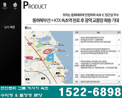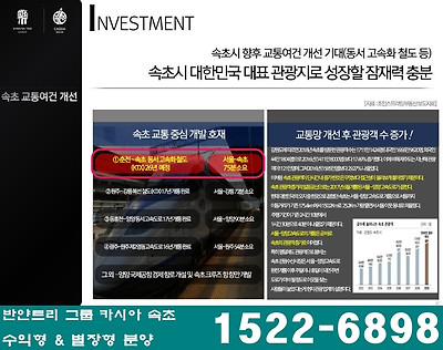 - 7번국도와 동해고속도로를 연결하는 속초IC와 양양IC 인접, KTX속초역 개통되면 편리한 광역 교통망 인프라