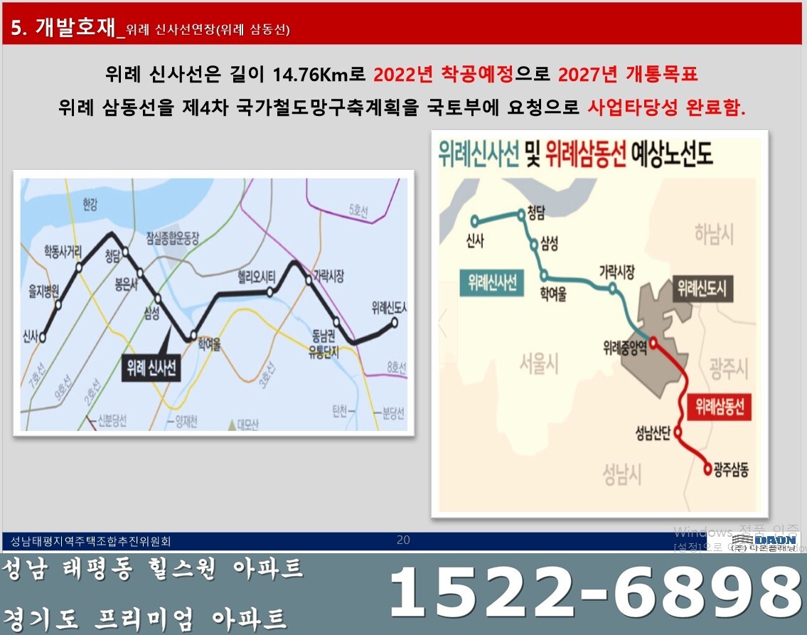 - 위례 신사선은 2022년 착공예정으로 2027년 개통목표, 위례 삼동선을 제4차 국가철도망구축계획을 국토부 요청으로 사업타당성 완료함