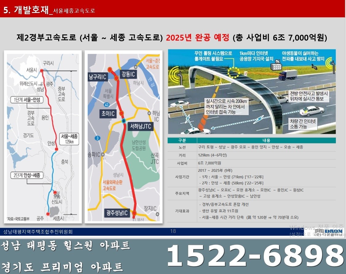 - 제2 경부고속도로 (서울 - 세종 고속도로)2025년 완공예정 (총 사업비 6조 7천억원)