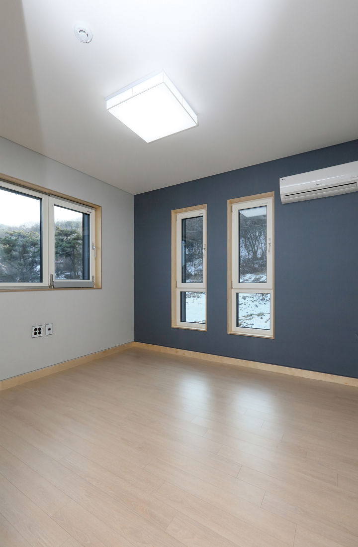 1층에 위치한 안방. 밝고 산뜻한 분위기를 원하던 건축주 부부의 방은 민트색 벽지로 마감했다.
