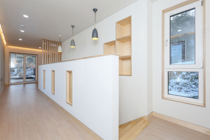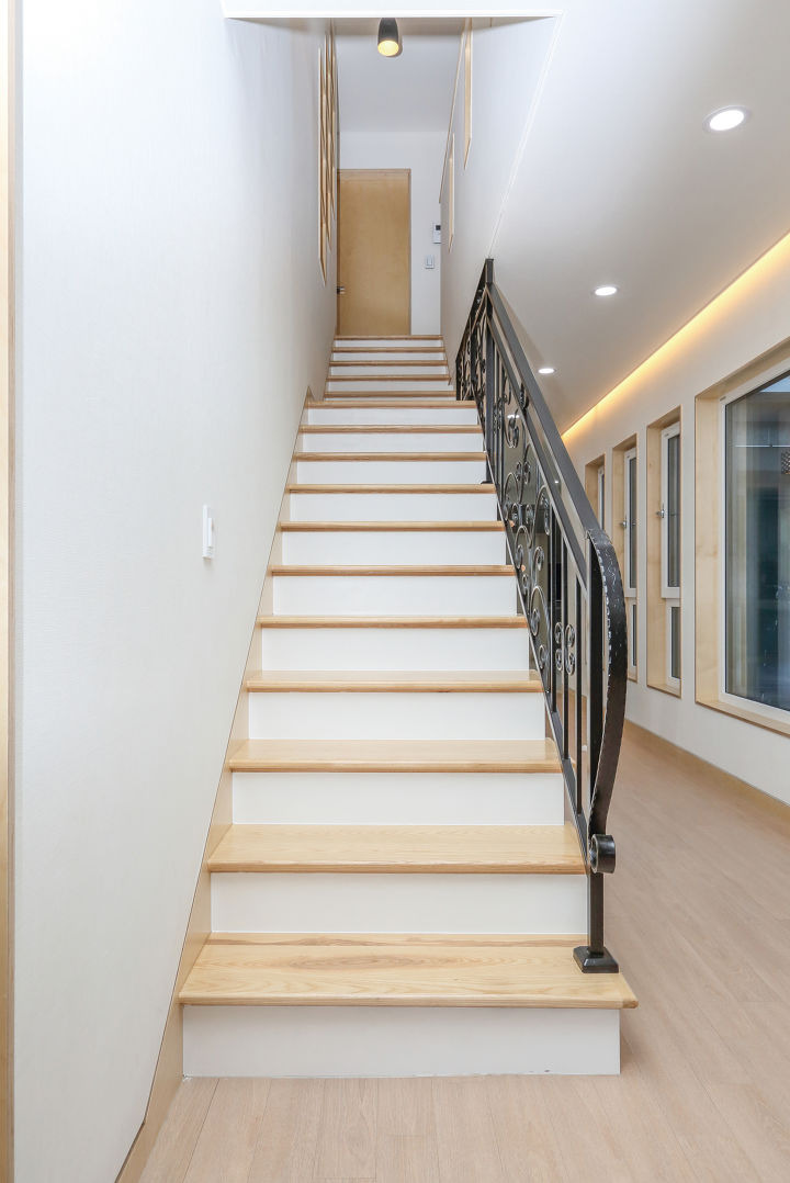 애쉬 원목판으로 화이트 톤 벽지와 어울리도록 했고 단조 난간을 설치했다.
