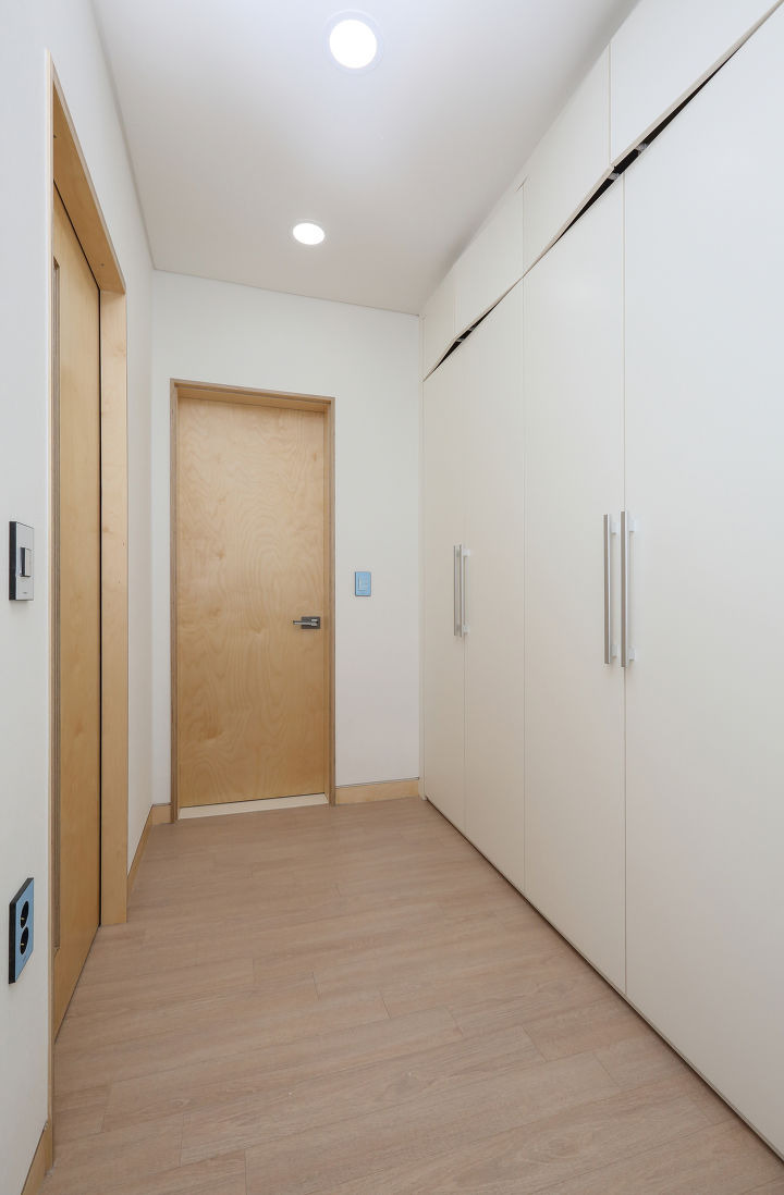 현관은 붙박이장을 설치해 공간의 활용도를 높이고 하단에 은은한 조명을 설치했다.