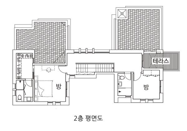 2층은 긴 복도를 사이에 두고 좌·우로 2개의 자녀 방을 분리 배치했다. 특징은 1층과 마찬가지로 실별로 욕실을 계획했다는 점이다. 건축주는 새 집을 짓고부터 가족 간 욕실 쟁탈전이 사라졌다고 한다.
