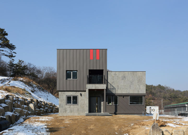 주택의 입구. 현무암과 알루미늄 강판이 조화롭다. 테라스 위 빨간 부분이 주택에 생동감을 더한다. 외단열에 모르타르 메쉬 미장을 기본으로 그 위로 20T 현무암 석재를 붙이고, 돌출된 알루미늄 강판에 합판을 2중으로 시공해 단열성을 높였다고 한다.