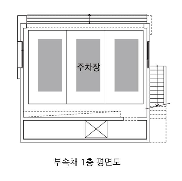 드레스룸과 욕실을 둔 안방과 연결된 후면의 중정은 부부가 인접한 뒷산을 바라보며 오붓하게 차를 마시며 여유를 즐길 수 있는 공간이다. 이 중정은 게스트룸 사이에 공용 화장실이 있어 프라이빗 공간으로 손색이 없으며, 뒷산 조망뿐만 아니라 남서향이라 자연광도 풍부하다.