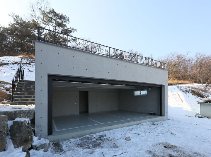 시야가 열린 북동쪽으로 주택의 좌향을 잡았는데, 문제는 북쪽 50m 전방에 있는 건축주의 양계장이 시야를 가린다는 것이었다. 조망을 확보하고자 집터를 0.8m 성토盛土했지만, 그래도 시야를 완전하게 확보할 수는 없었다. 설계 및 시공사에서 대안으로 찾아낸 것이 원경을 끌어들이는 차경借景 대신 중정中庭을 활용한 조경造景을 택했다. 주택을 ‘H’형태로 배치해 각 실에서 앞뒤에 있는 중정을 내다보도록 계획한 것이다. 중정을 전면인 동북향으로는 거실과 주방/식당 사이에, 후면인 남서향으로는 안방과 게스트룸 사이에 뒀다. 겨울의 문턱에 건물을 준공했기에 중정의 조경공사는 봄으로 미뤄놓은 상태다.
