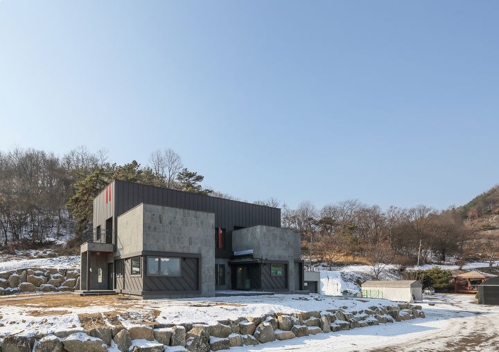 건축주 박병곤·김학유 부부가 예전에 손수 지은 작은 황토집을 헐고 가족 구성원에 맞춰 새로 지은 횡성 주택. 외벽에 현무암과 알루미늄 강판으로 포인트를 주어 세련된 느낌을 자아낸다. 대지의 여건을 고려해 주택을 ‘H’형태로 배치함으로써 앞뒤에 중정을 만들고, 각 실을 좌우에 선이 굵게 배치한 점이 돋보인다.