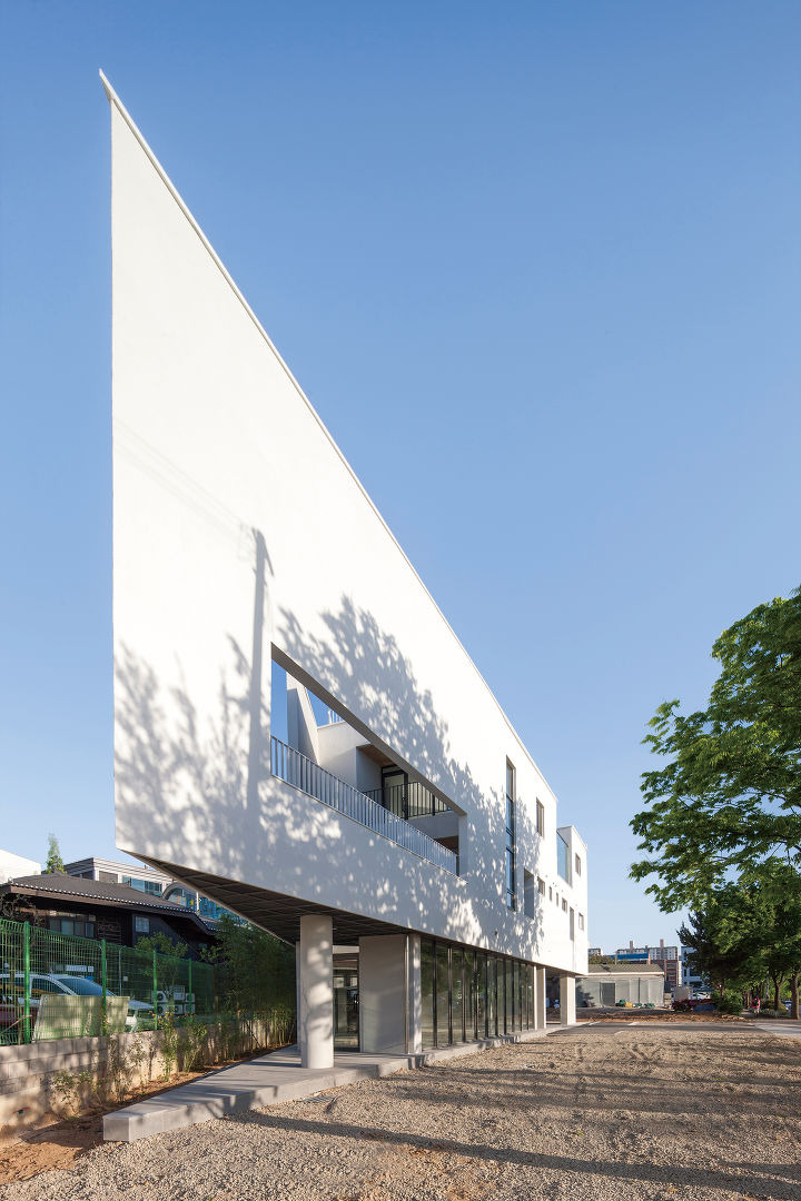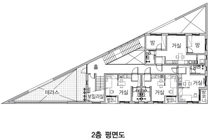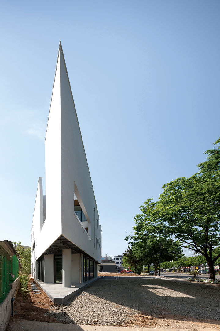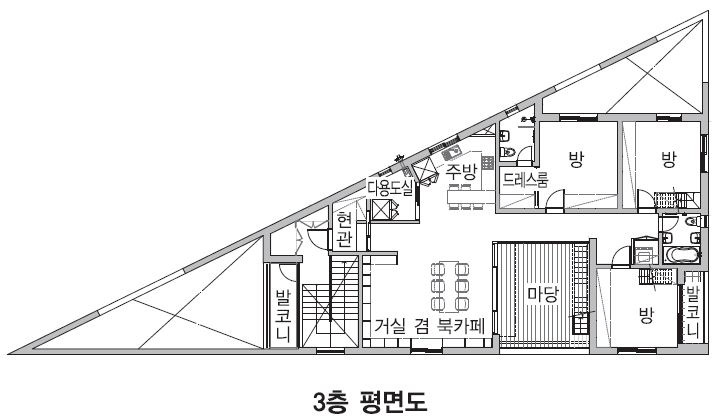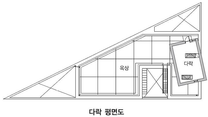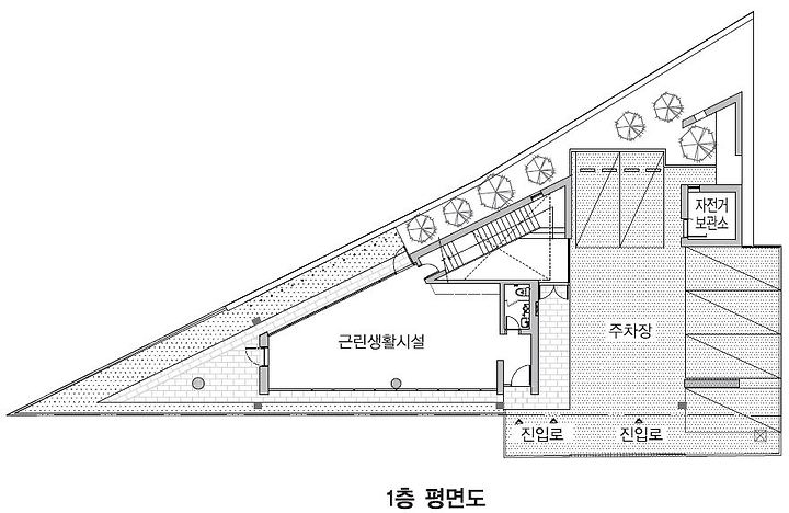 삼각형 모양의 필지는 그대로 삼각형의 기하학적 형태가 된다. 삼각형의 기하학은 전체적인 틀을 만들고 사각의 실들로 채우면서 생기는 틀과 실의 사이는 공간의 깊이를 더해 준다. 여기서 사이 공간으로 생기는 삼각형 틀의 벽체는 내부에서 외부를 바라보는 프레임을 만들면서 주변과의 관계를 제어하게 된다.