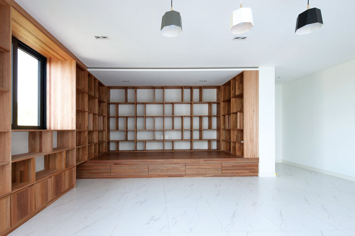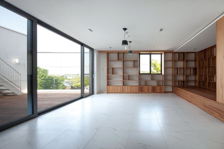 건축주 세대 거실. 거실 겸 북카페로 계획해 발코니 맞은편에 평상을 설치하고 편히 책을 보도록 했다.