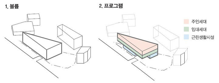 건축주는 1층 근생시설, 2층 임대 주거, 3층 자가 주택을 구성하고 싶어 했다. 필지의 크기에 비해 용적률(법정 120% 이하)이 여유가 있기에 거주자들에게 더욱 좋은 환경을 제공할 수 있는 경쟁력 있는 건물을 원했다. 자가 주택은 자연 채광과 환기가 잘 되고 마당과 함께 자녀들의 꿈인 다락이 있는 공간으로 계획했으면 했다.