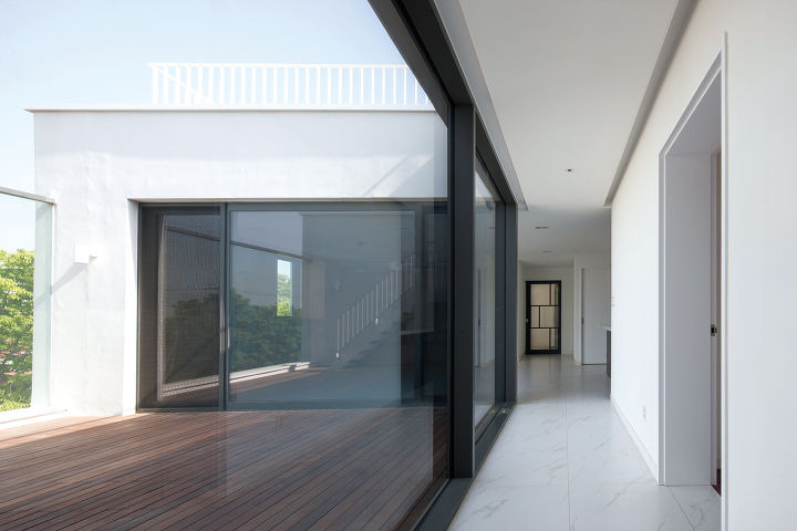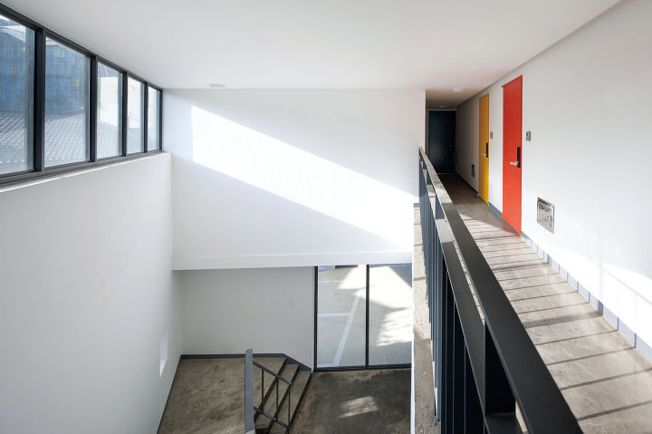 삼각형의 형태는 수직 깊이가 다른 3개의 마당을 품고 있다. 이들 마당은 내부와 연계된 이벤트 공간이면서 층간으로 분리된 프로그램들이 시각적으로 소통할 수 있는 깊이감을 만든다. 바로 주차장 쪽에 있는 3개 층 깊이의 마당과 2층 임대 주거에 배려된 2개 층 깊이의 마당, 그리고 주인 주택에 거실과 연계된 1개 층 깊이의 마당이다. 3개의 마당은 수직적으로 깊이를 만들면서 수평적으로 각 층에서 주변을 조망할 때 시각적인 프레임을 만들어 준다.