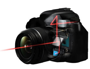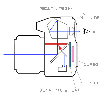 렌즈를 통해 들어온 빛이 반사 미러에 의해 반사되어 펜타프리즘을 통해 사진사의 눈에 전달되는 구조로