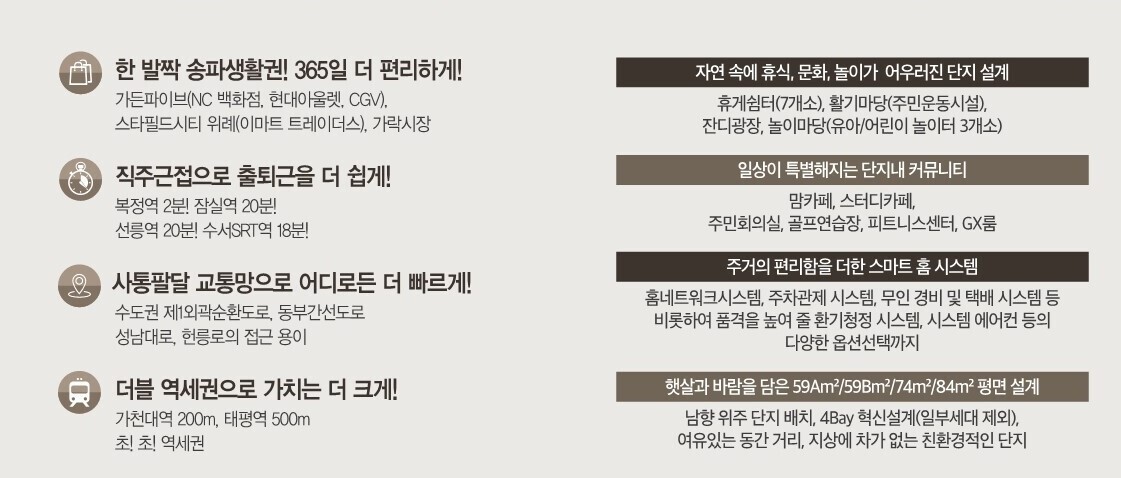가: 송파역까지 5 정거장으로 롯데월드 ,가든 파이브(NC 백화점.현대 아울렛.CGV) 등 접근성 우수하여 강남권 생활권 가능