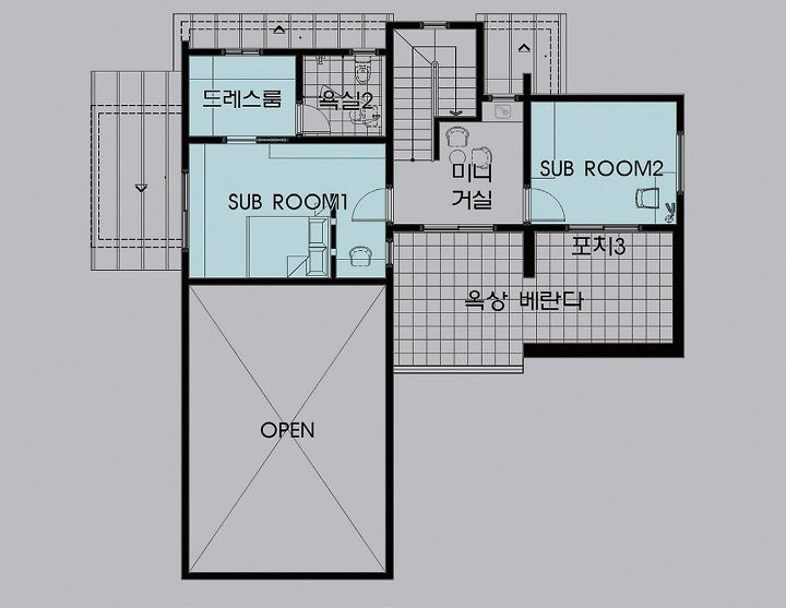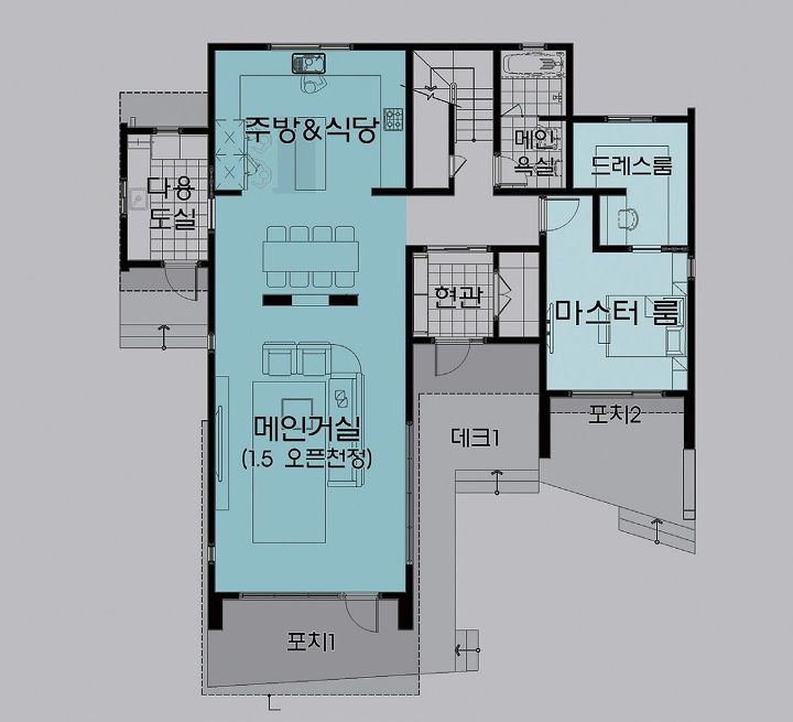 데크를 거실이 있는 남향과 동향에 배치하고 거실과 일체화된 주방에서 이를 지켜볼 수 있게 했다. 1층은 공용 공간과 안방, 2층은 자녀방을 둬 자녀들의 프라이버시를 확보하는 데 중점을 뒀다.