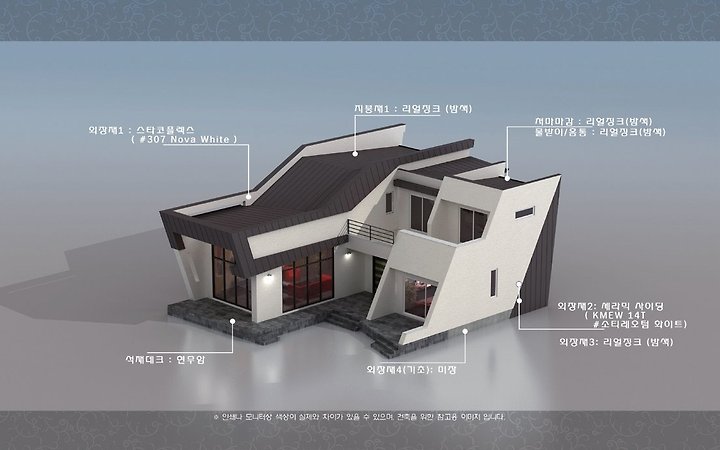 엘리시움의 디자인이다. 거실을 길게 빼고 매스 사이사이에 기울기를 줘 마치 하늘로 비상하는 우주선 같은 외관을 창출했다.