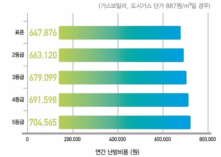 에너지 소비 효율 등급_효율이 높은 보일러는 같은 양의 에너지로 더 많은 열을 생산하면서도 난방비를 줄여준다. 따라서 에너지 소비 효율 등급 표시를 확인하면 선택에 도움이 된다. 특히 가정용 보일러는 다른 가전제품과 마찬가지로 1~5등급으로 표시된다. 1등급에 가까울수록 에너지 절약형 제품이기에 1등급 보일러를 선택하는 것이 바람직하다.