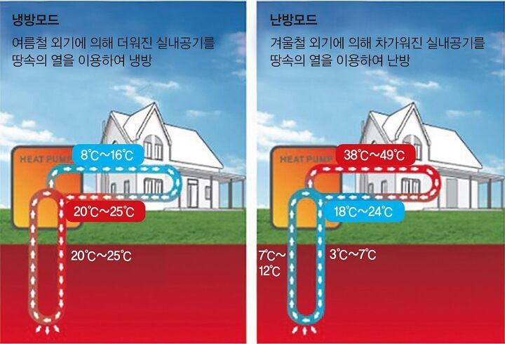토양, 지하수, 지표수가 가진 열에너지를 지열이라고 하며, 연중 약 15℃의 일정한 온도를 유지한다고 한다. 지열보일러는 지열의 온도를 히트펌프로 흡수(열교환)해 가정의 난방과 냉방에 이용하는 방식이다. 다른 에너지원에 비해 외부환경의 영향을 덜 받는 장점이 있다. 에너지관리공단은 “지열히트펌프를 설치해 냉난방에 사용할 경우, 연간 냉난방 비용이 약 360만 원인 주택에서 연간 약 168만 원을 절감할 수 있다”고 한다(난방 시 등유 보일러, 냉방 시 17.5㎾ 에어컨 사용 기준).