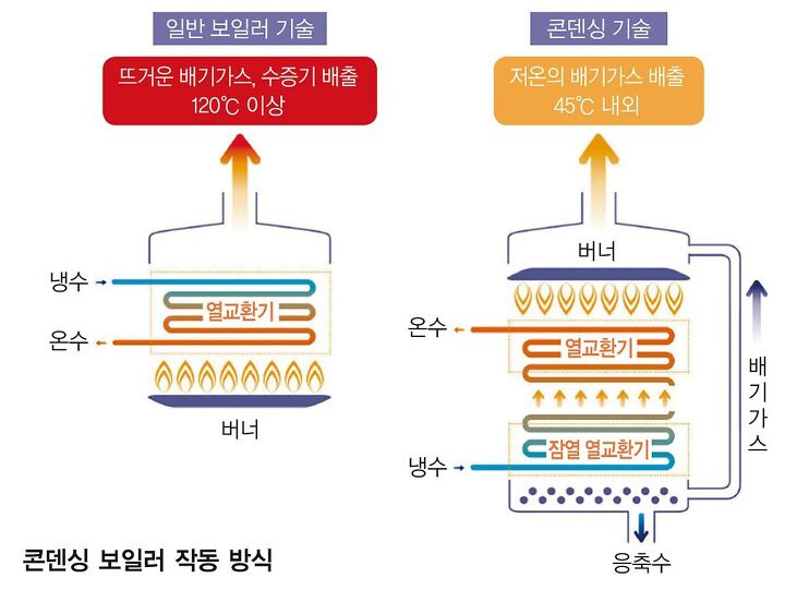 일반 보일러는 가스를 연소시켜 물을 데우고, 그 물을 데운 후 남은 열은 배기구를 통해 빠져나간다. 이렇게 빠져나간 배기가스도 많은 에너지를 가지고 있는데, 콘덴싱 보일러는 이를 흡수해 다시 한번 물을 데우는 데 사용하며 열 손실을 줄인다. 열효율이 높은 콘덴싱 보일러를 사용하면 같은 양의 에너지로 더 많은 열을 생산하기에 난방비 부담이 줄어든다.