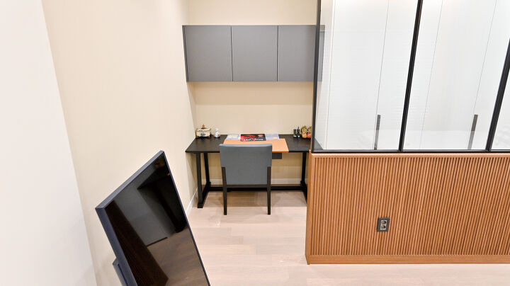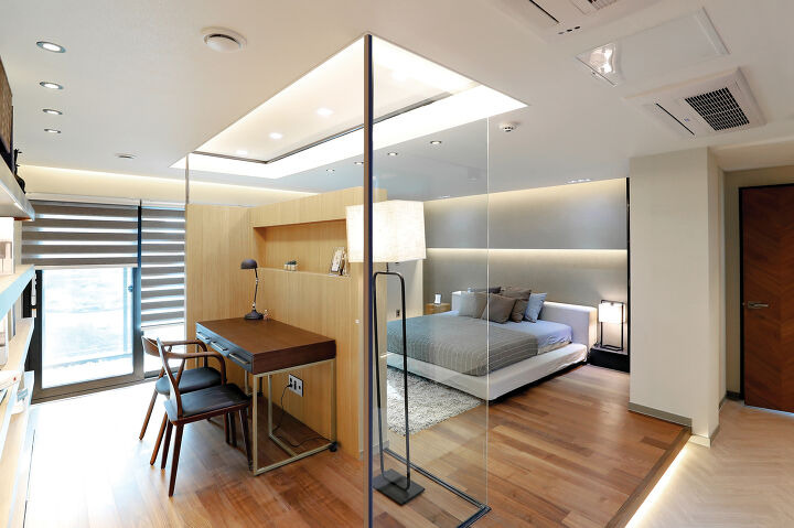 침실과 사무공간을 분리한 케이스. 재택근무 중인 직장인이나 대학생 자녀에게 적합한 인테리어다. 책상과 맞춤 옷장 공간을 침실 공간과 분리했다. 반 가벽과 유리 파티션을 접목해 공간 분할과 개방감 모두 살렸다.