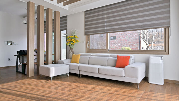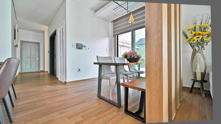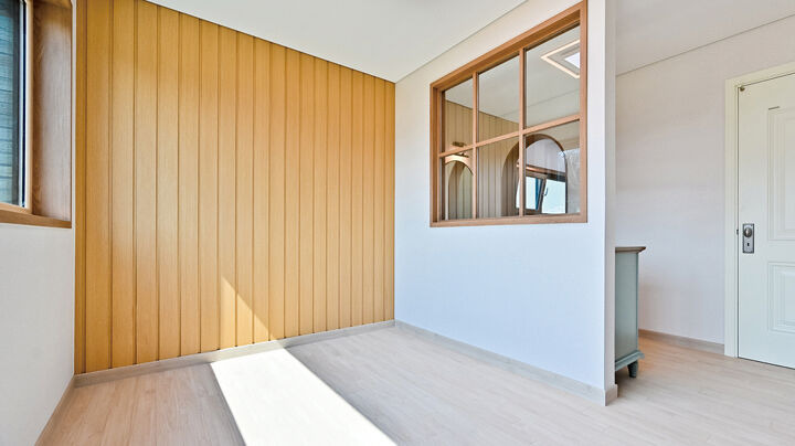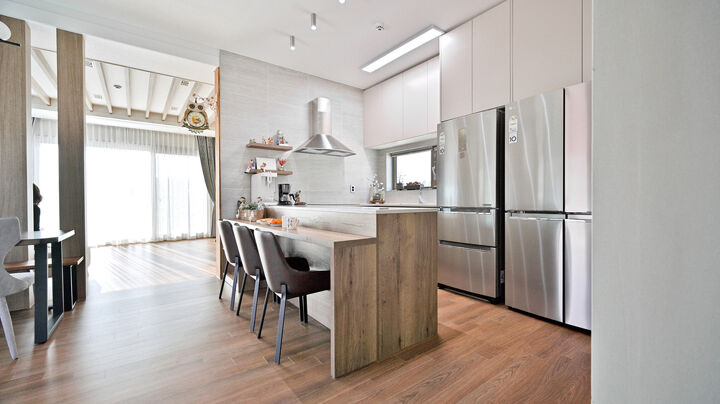 나무 판재를 루버형으로 세워 가벽을 만들었다. 루버형 가벽은 거실과 주방을 나누면서도, 주방에서 거실 전면 창을 통해 바깥 풍경을 감상할 수 있도록 했다. 나무 소재의 루버로 따뜻하며 아늑한 분위기까지 느껴진다.