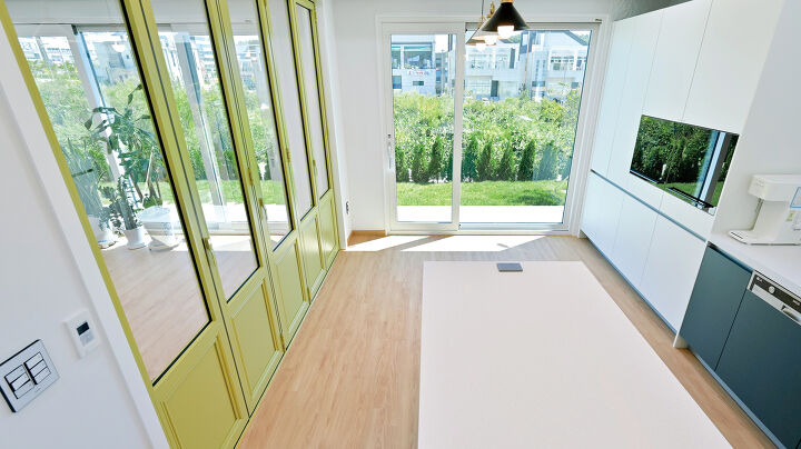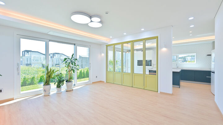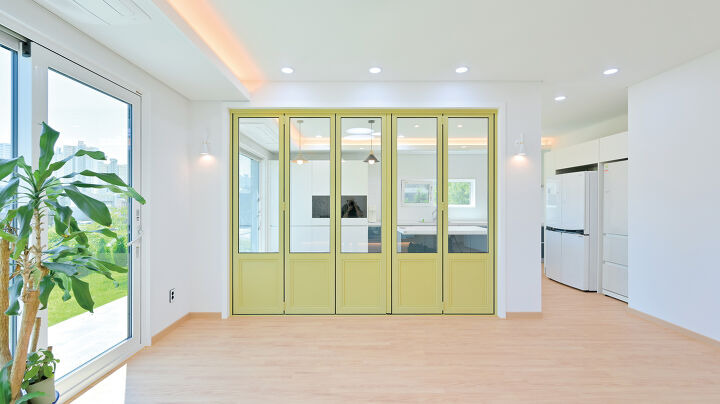 거실과 주방 사이에 폴딩도어를 달아 공간 활용성을 높인 사례. 가족 구성원 여럿이 모일 때, 식사하는 이들과 거실에서 담소를 나누는 이들이 한 공간에 함께 할 수 있다. 라임옐로 폴딩도어에 디자인 LED 조명과 천장의 간접등박스를 설치해 세련되면서 고급스러운 분위기를 연출했다.