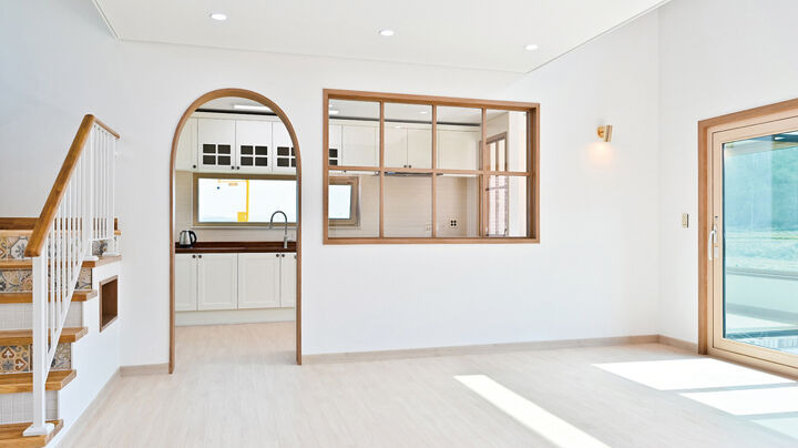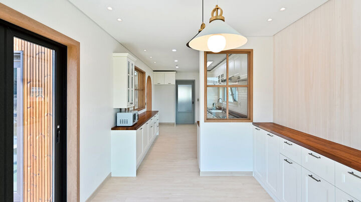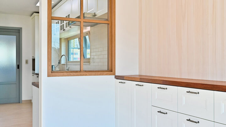 주방에 가벽을 설치해 거실과 공간 분리한 케이스. 전면으로 차단했지만, 오픈형 출입구와 창문으로 개방감을 확보했다. 또한 출입구와 창문틀은 나무로 마감해 따뜻함과 차분함을 강조했다.