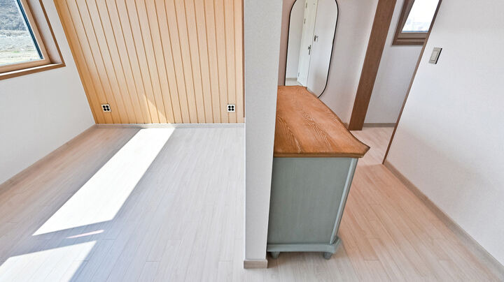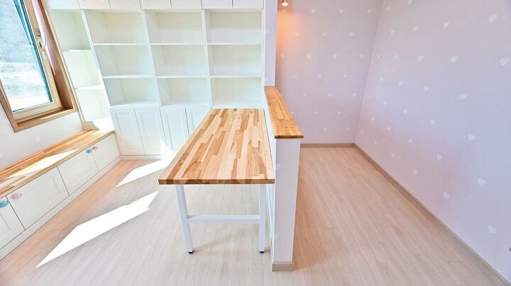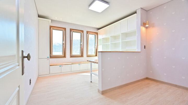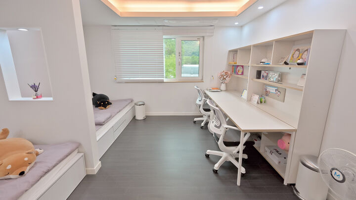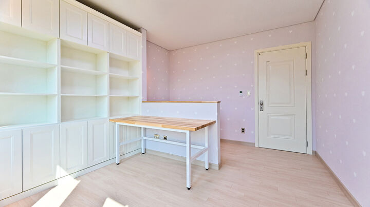 공부방 겸 침실로 사용하는 아이방은 집중력 향상과 정서적 편안함을 주기 위해서 공간을 나누는 것이 좋다. 한 공간에 두 개의 기능을 부여할 때 더욱 요긴한 것이 바로 가벽. 공부하는 공간과 침실 공간 사이를 낮은 가벽으로 나누어 공간의 기능은 나누지만 시야는 개방감 있게 유지했다.