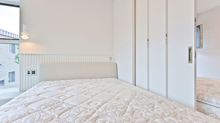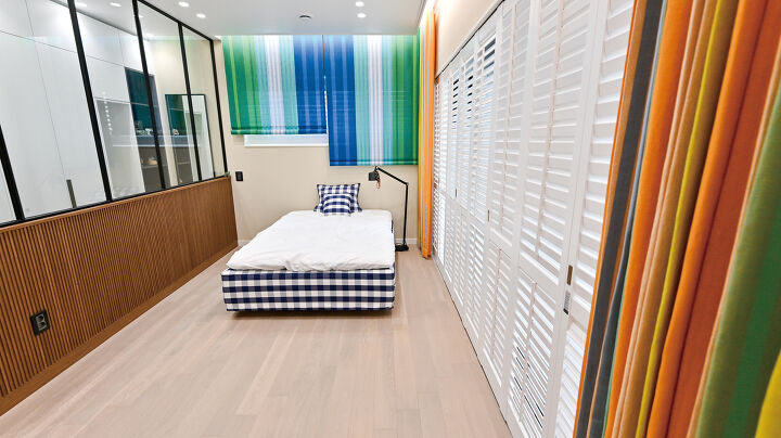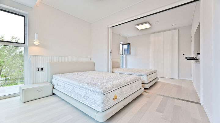 늦게까지 TV를 시청하는 남편과 아침 일찍 일어나는 아내, 서로 다른 라이프사이클을 가진 부부를 위한 침실이다. 두 침대 사이에 포켓도어를 설치해 잠들 시간에는 문을 닫아 공간을 분리할 수 있도록 했다.
