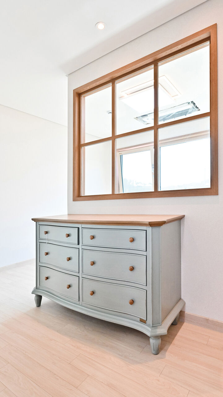 좁은 공간일수록 가벽을 세우면 공간 활용도가 높아지고, 깔끔한 분위기를 낼 수 있다. 격자창으로 가벽의 답답할 수 있는 단점을 해소하고, 전면에 거울을 더해 파우더룸을 완성했다.