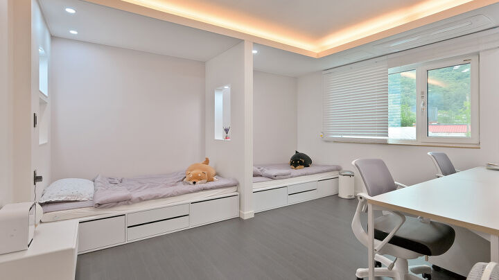 두 아이가 함께 사용하는 방. 가로로 긴 공간 사이에 가벽을 세워 2개의 침실을 만들었다. 가벽 위쪽을 부분적으로 개방해 따로 잠들지만, 같이 있는 정서적 안정감을 가질 수 있도록 했다. 침상 하단 공간은 서랍을 만들어 수납장으로 활용한다.