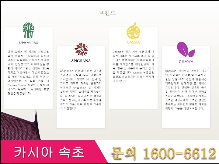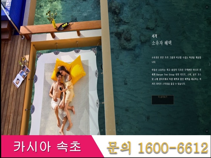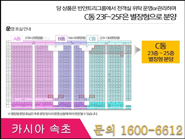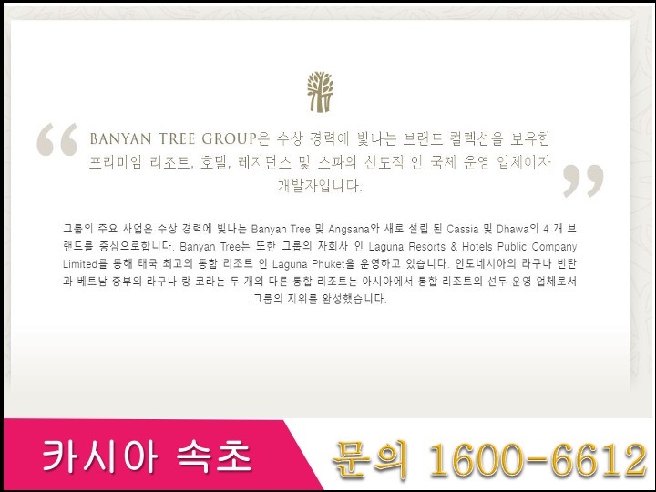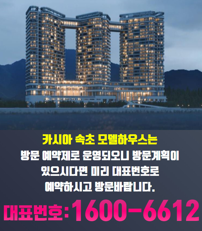 마지막으로 반얀트리 그룹에서 운영하는 카시아 속초’ 상품은 현재 회사보유분 특별분양으로 성황리에 상담중에 있습니다. 보다 자세한 안내는 서울시 강남구 학동사거리 인근에 모델하우스 VIP라운지를 방문하여 상담이 가능하며, VIP라운지는 코로나로 인하여 100% 사전 예약제로 운영되며, 대표번호를 1600-6612 번호를 통해 분양가 상담 및 방문예약이 가능합니다.