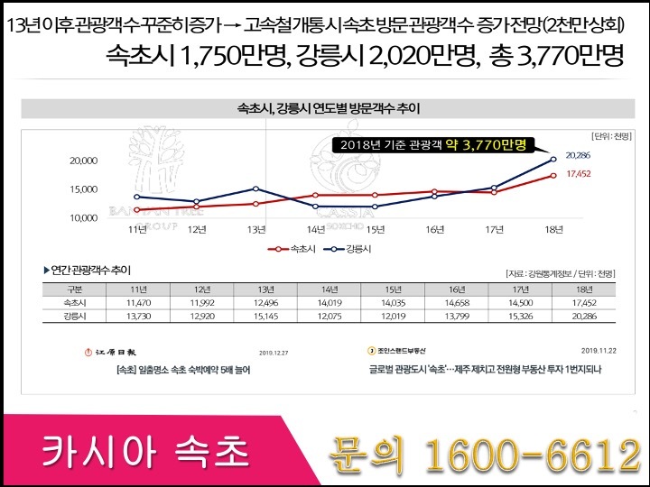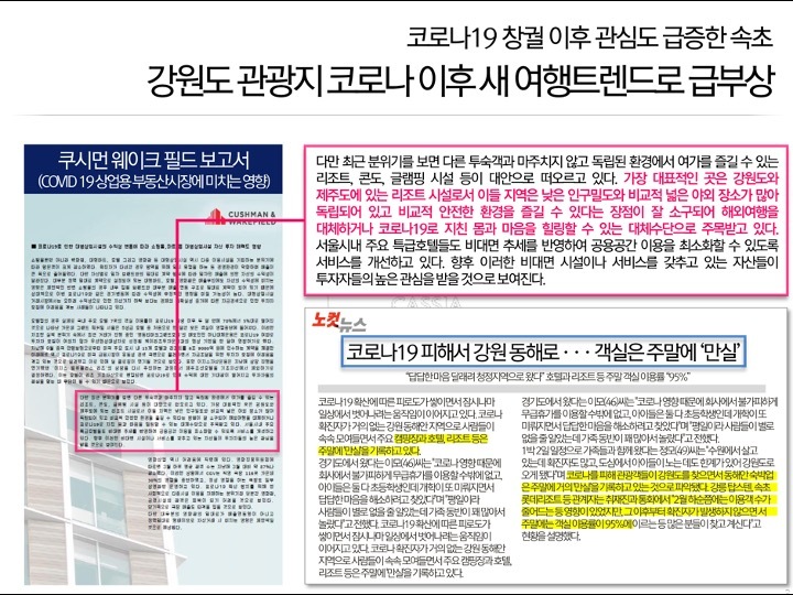 속초는 새롭게 청정도시로 각광받는 중이니, 어려운 경기불황 속에서 유일하게 홀로 우뚝 설 것으로 관측됩니다. 밖으로 나가지 않고 실내에서 모든 것을 누리기에 부족함 없는 환경이며, 도심에서 벗어나 진정한 사회적 거리두기를 실현하기에 좋은 조건을 가지고 있습니다. 해외로 나가지 못하는 지금 가장 유망관광지로 손꼽히는 만큼 코로나19를 피해 오시는 이용객분들이 더 늘어날 것으로 보여집니다.