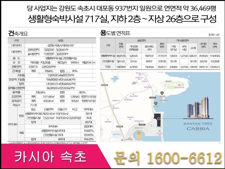 정확하게 위치하게 되는 곳은 강원도 속초시 대포동 937번지 일원으로 연면적 약 36,469평의 규모 속에서 만나보게 조성됩니다. 생활형 숙박시설 717실이 지하 2층에서 지상 26층으로 구성되어 있습니다. 이 717실은 다양함을 제공해주기 위해 전용면적 9.56평~88.77평 구성으로 전체 36개 타입으로 조성된다는 것까지 확인해볼 수 있습니다. 또 반얀트리그룹에서는 전 객실 위탁 운영 및 관리를 하는데 C동의 경우 23층에서 25층이 별장형으로 분양중에 있다고 합니다.