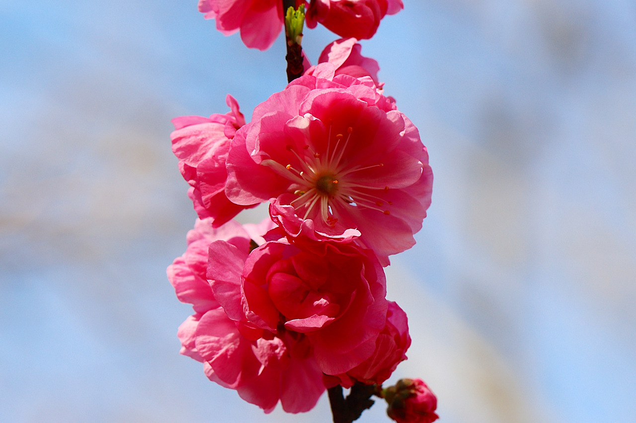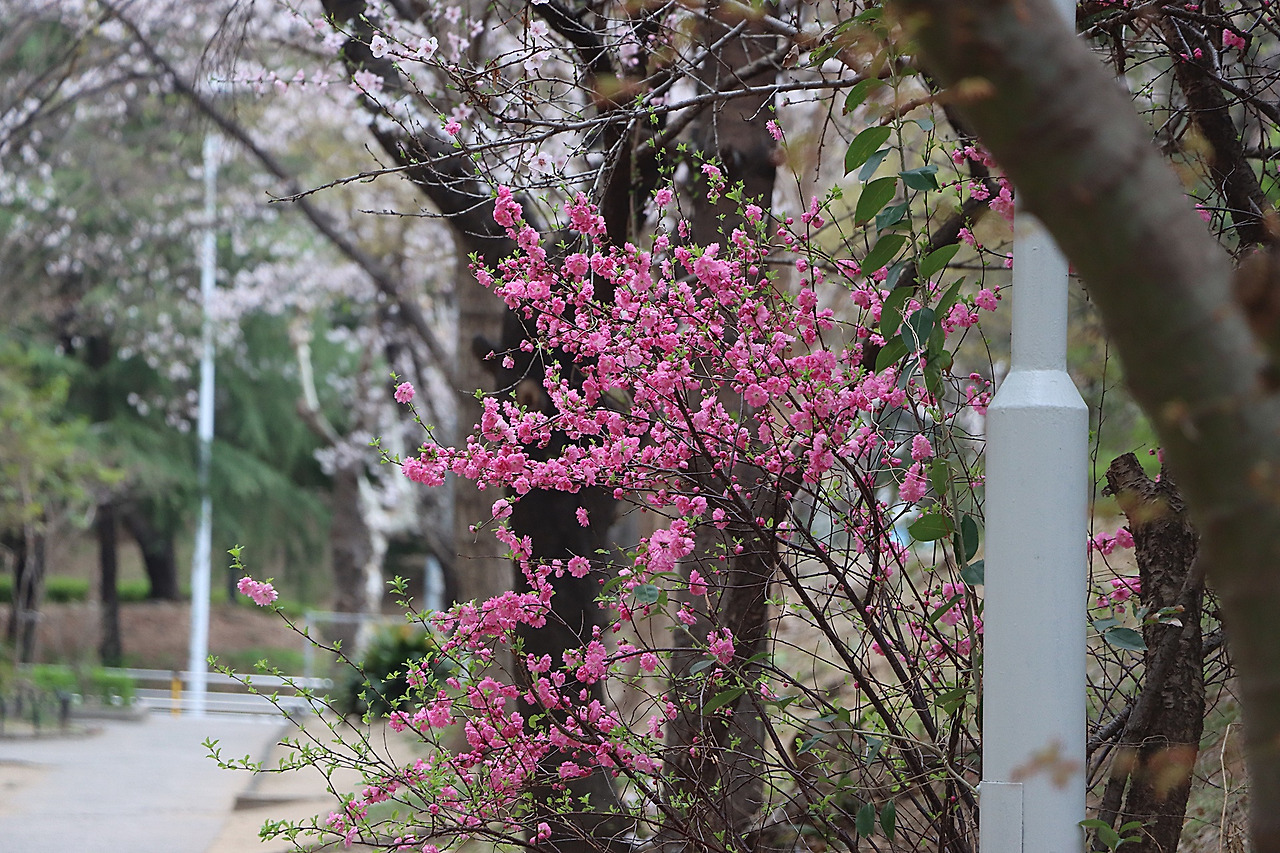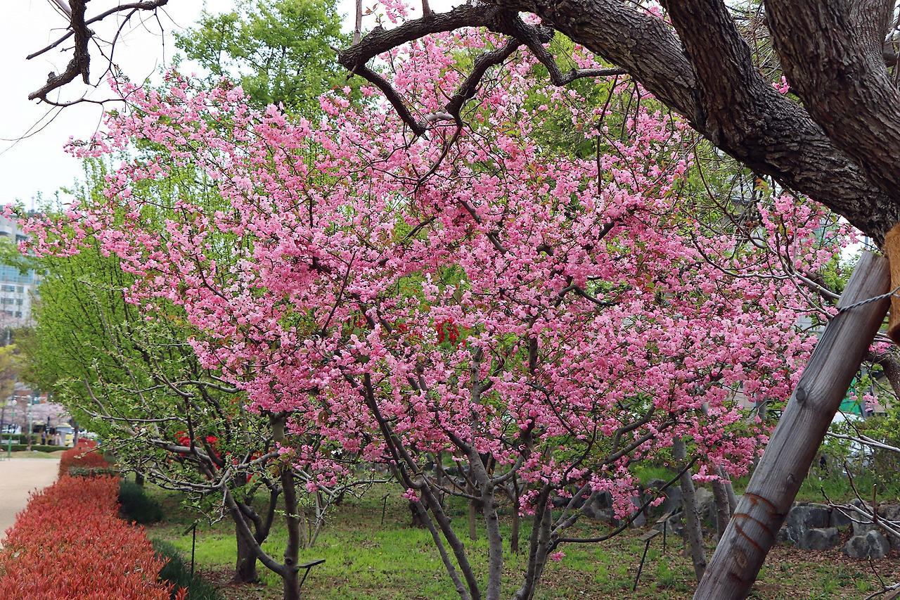 잎이 돋기 전 꽃봉오리가 진분홍색으로 부풀어오르는데 꽃이 만개하면