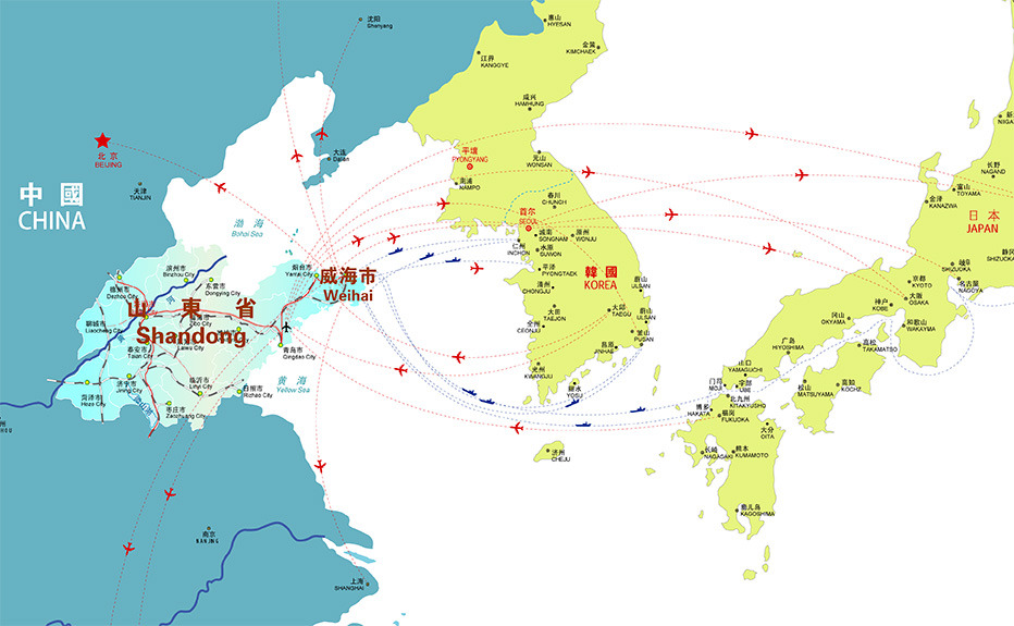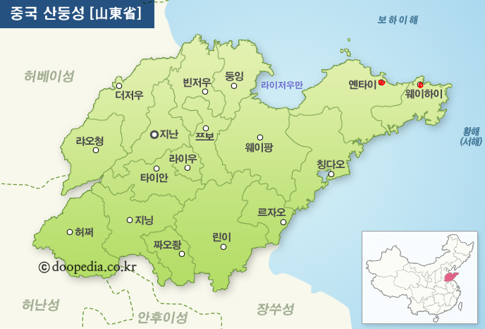 산둥 반도의 동쪽에 있다. 삼면이 바다로 둘러싸여 있어서, 북동남은 황해에 면해 있고, 북쪽 방향은 랴오둥 반도와 가깝고, 동쪽 방향은 한반도와 가깝다.