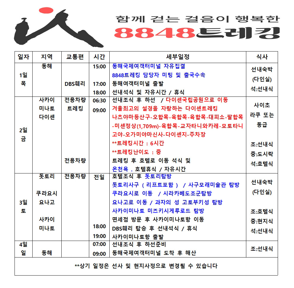 작성자알파인(노태우)작성시간25.11.21조회수247 목록 댓글 2DBS훼리이용 목요일출발 / 일요일도착으로 변경 진행합니다