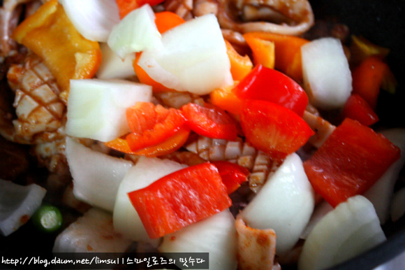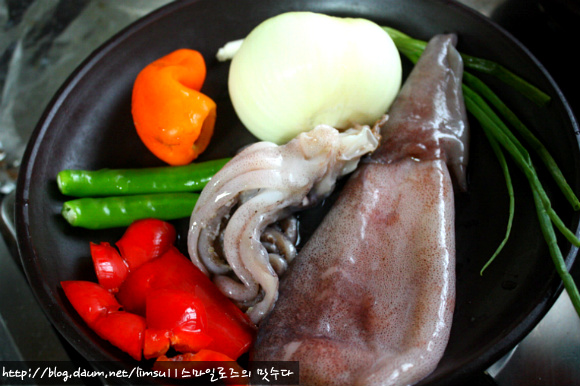오징어2마리 양파대1/2 꼬마파프리카2개 청량고추2개 쪽파 다진마늘1큰술 양념:굴소스1.5큰술 고추가루1큰술 맛술1큰술 매실청1큰술 후추조금 포도씨유 참기름 통깨