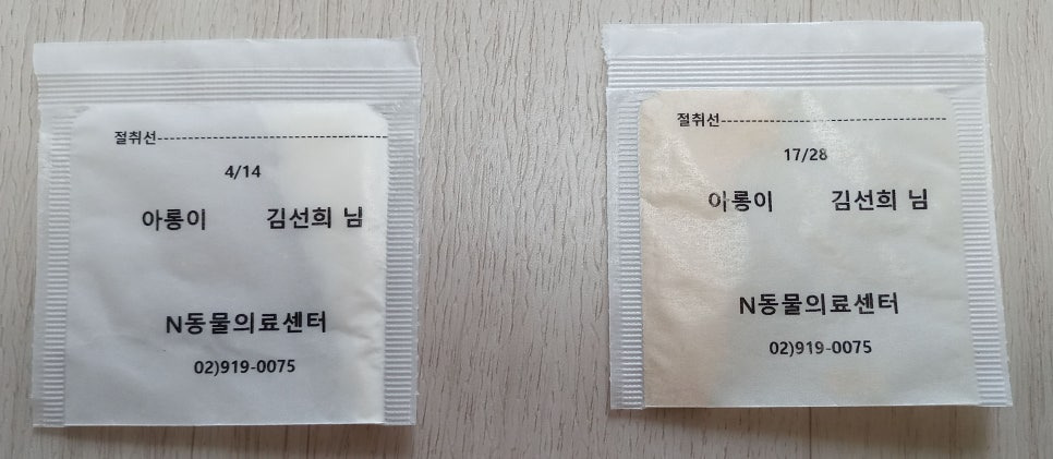 왼쪽 강아지 기침이 많아서 처방한것 오른쪽은 염증수치가 높아서 처방한것