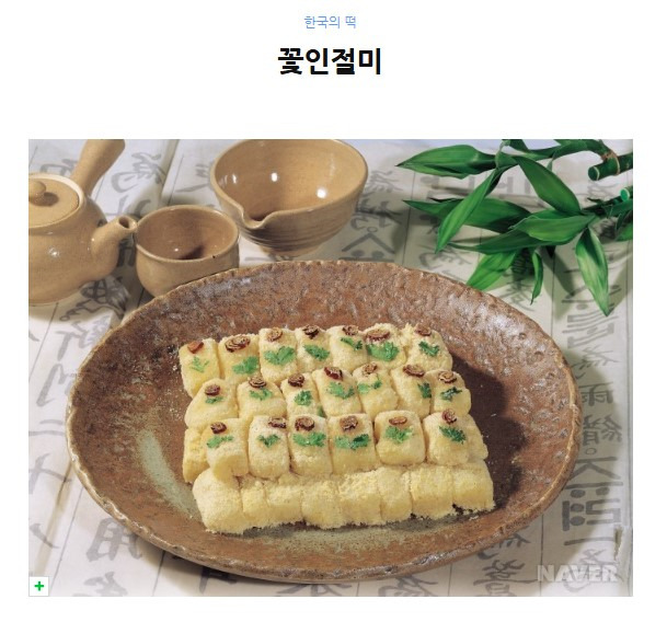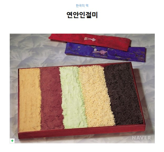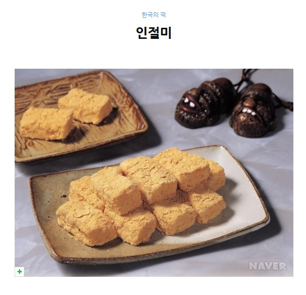 인절미는 충분히 불린 찹쌀을 밥처럼 쪄서 안반이나 절구에 담고 떡메로 쳐서 모양을 만든 뒤 고물을 묻힌 떡이다. 인절미는 이두(吏讀)로 인절병(印切餠), 인절병(引切餠), 인절미(引截米) 등으로 불리어 지는데, 잡아 당겨 자르는 떡이라는 의미에서 생긴 이름이다. <증보산림경제>, <임원십육지>, <성호사설>에서는 콩고물을 묻힌 인절미가 기록되어 있으며 <주례(周禮)>에는 인절미를 떡 중에서 가장 오래된 것이라고 하였다.