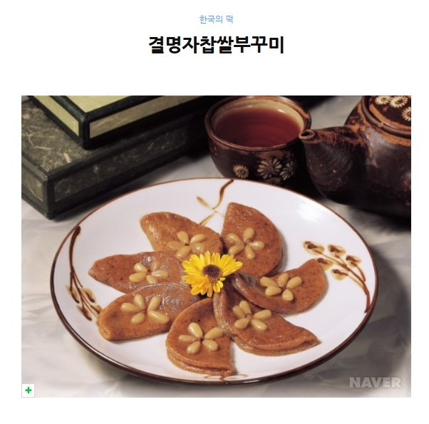 결명자찹쌀부꾸미는 찹쌀가루에 결명자가루를 섞어 익반죽한 다음, 소를 넣지 않고 동글납작하게 기름에 지져 낸 맛과 색상이 독특한 떡이다. 부꾸미는 《조선무쌍신식요리제법, 1943》에 처음으로 '북꾀미'라 기록되어 있는데, 형태와 모양의 대소, 재료에 따라 각기 다르게 불리며 결명자찹쌀부꾸미 역시 결명자와 찹쌀을 주재료로 사용한다고 해서 붙여진 이름이다. 부재료인 결명자(決明子)는 장기 복용하면 강장 효과뿐만 아니라 눈이 밝아진다고 하여 예부터 음료로도 많이 애용해 오던 약이성 재료이다.