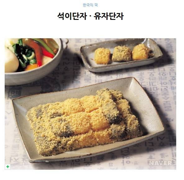 석이단자와 유자단자는 석이버섯가루와 다진 유자청건지를 찹쌀가루에 각각 섞어 찜통에 쪄낸 후 꽈리가 일도록 쳐서 한입 크기로 썰어 잣고물을 묻힌 떡이다. 인절미보다 크기가 작으며 원래는 단독으로 쓰이는 것이 아니라 각색편의 웃기로 쓰였다. 석이단자의 그윽한 색과 잣의 고소한 맛이 잘 어울리며, 유자단자의 향긋한 유자향이 씹을 때마다 배어 나오는 아주 귀한 떡이다. 석이단자는 <군학회등(軍學會騰), 1800년대 중엽>에 처음 나타나고 <음식방문(飮食方文)>을 비롯하여 <조선요리법(朝鮮料理法)> 등 여러 문헌에 소개되고 있다.