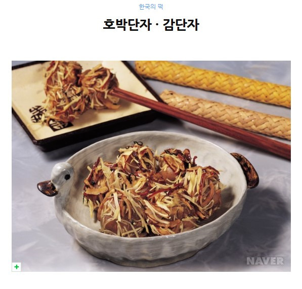 호박단자와 감단자는 찹쌀가루에 찐 단호박과 연시를 각각 섞어 찜통에 쪄낸 후 꽈리가 일도록 쳐서 한 입크기로 썰어 밤채, 대추채, 석이채의 고물을 묻힌 떡으로 화려한 색상과 잘 굳지 않는 특성이 있어 잔칫상에 많이 쓰인다. 호박은 임진왜란 이후 선조 때 중국에서 우리나라에 들어왔는데, 승려가 먹는 채소라는 뜻의 '승소(僧蔬)'라고 불려지다가 세상에 널리 알려지게 되었다. 호박과 감 모두 저장성이 좋기 때문에 겨우내 두고 먹을 수 있으며 이를 음식에 이용함으로써 겨울철에 부족하기 쉬운 비타민A의 섭취를 가능하게 하여 겨울철 감기, 기침, 호흡기 질환에 대한 저항력을 길러준다.