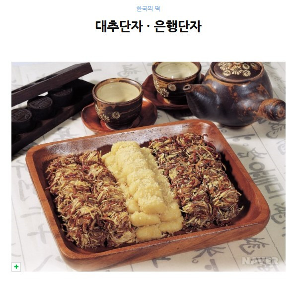 대추단자와 은행단자는 찹쌀가루에 다진 대추와 간 은행을 각각 섞어 찜통에 쪄낸 후 꽈리가 일도록 쳐서 한입 크기로 썰어 대추단자는 밤채, 대추채, 석이채고물을, 은행단자는 잣가루고물을 각각 묻혀 내는 것으로 대추단자의 진한 향과 은행단자의 깊은 맛은 가히 일품이라 할 수 있다. 은행단자는 궁중떡으로 <조선요리, 1940>에, 대추단자는 <음식법, 1854>의 ‘대조편’에 처음으로 소개되고 있다. 단자는 찹쌀가루에 섞는 재료에 따라 쑥구리단자, 은행단자, 석이단자, 밤단자, 대추단자, 승검초단자, 유자단자, 꿀단자, 팥단자, 토란단자, 건시단자, 마단자, 국엽단자, 복숭아단자, 율무단자, 귤병단자, 꿀단자 등의 이름으로 불린다. 집안의 행사나 계절마다 그 종류가 달라지는 단자는 1년 내내 즐겨 먹는 고급떡이다.
